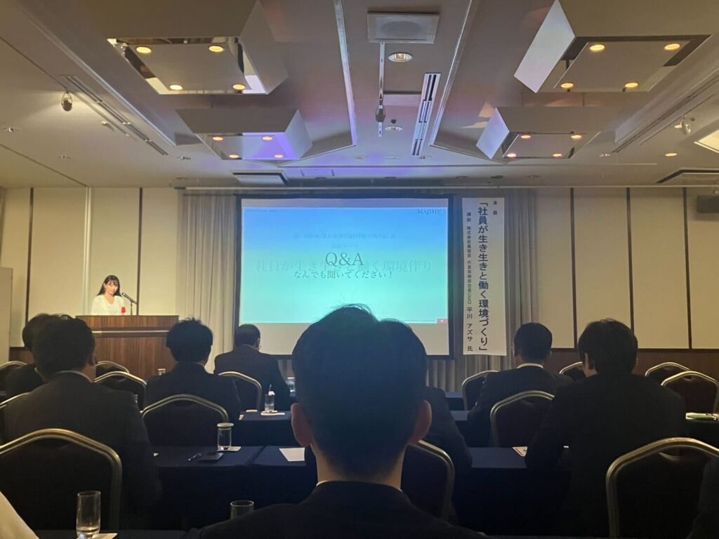 今回の講演テーマは 「社員が生き生きと働く環境づくり」。これまでの経営経験や「共感と熱狂の循環」を生み出すための取り組みについてお話ししました。